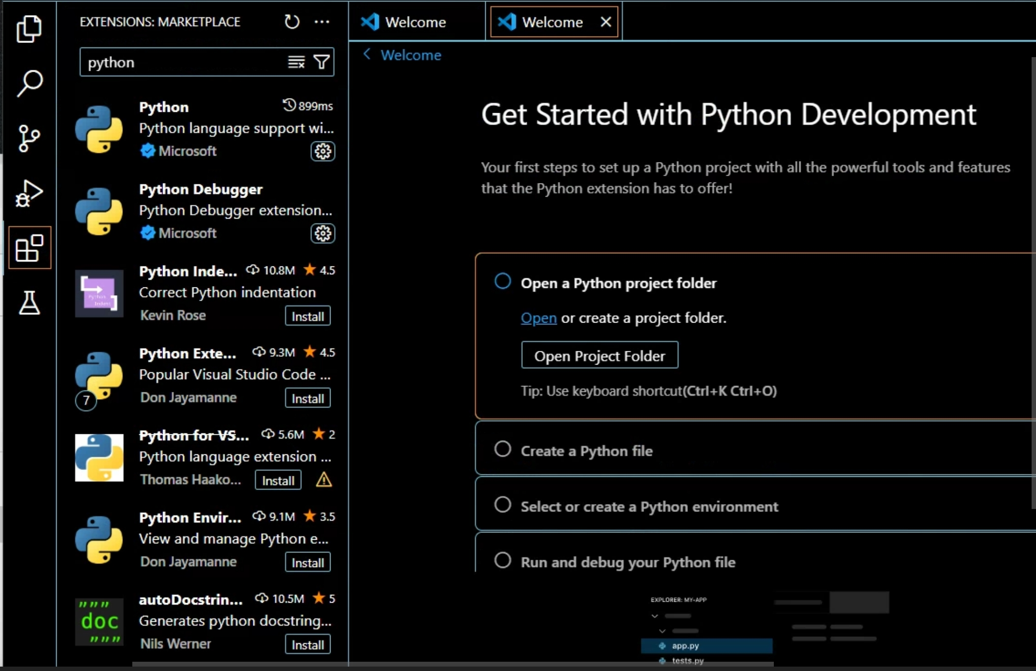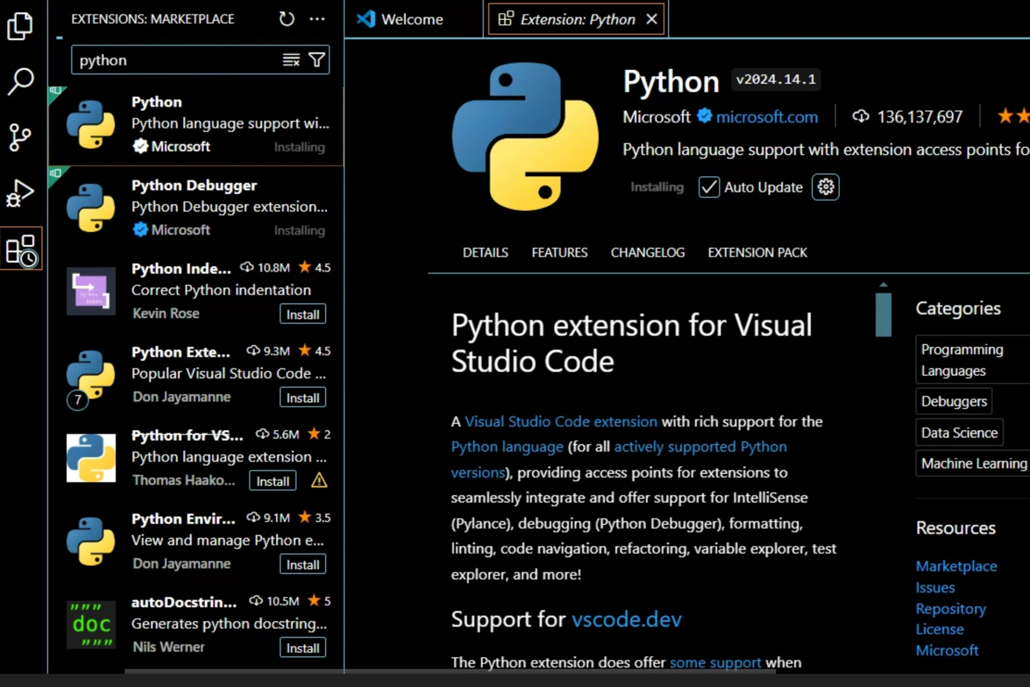 Extension은 맨 왼쪽 그림이 있는 메뉴에서 제일 아래 사각형 모음 표시입니다. 검색창에 python을 치시면 다양한 관련 패키지가 보이는데요. 그 중에서 Microsoft에서 제공하는 두가지만 설치합니다. Python와 Python debugger