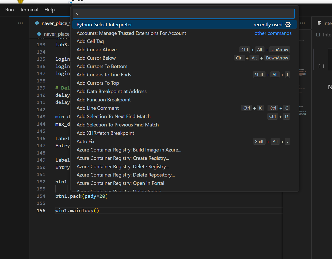 추가로 한가지만 하면 되는데요. 가상환경에 생성된 python 환경에서 이 코드를 실행하기 위해서 interpreter설정을 해줍니다. Ctrl + shift + P 를 누르면 아래와 같이 Python: Select Interperter가 나오는데요. 이 메뉴를 클릭합니다.