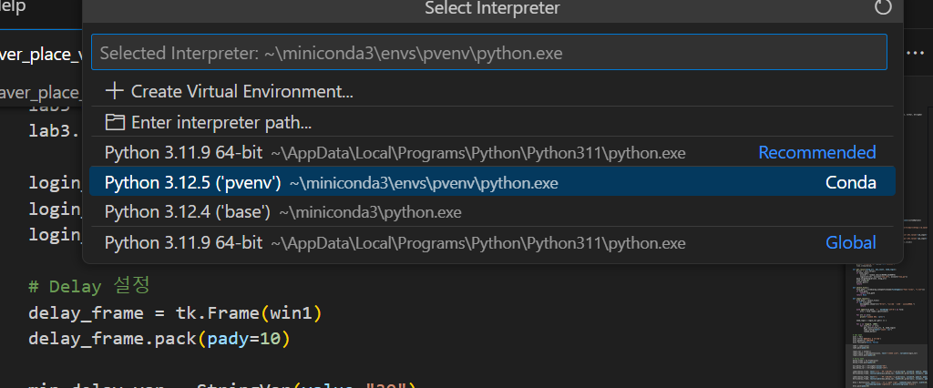 내 컴퓨터에 설치된 python 환경들이 나오게 됩니다. 그 중에서는 저는 Part1에서 설치한 miniconda 환경인 pvenv를 선택해서 python이 구동되도록 하겠습니다.