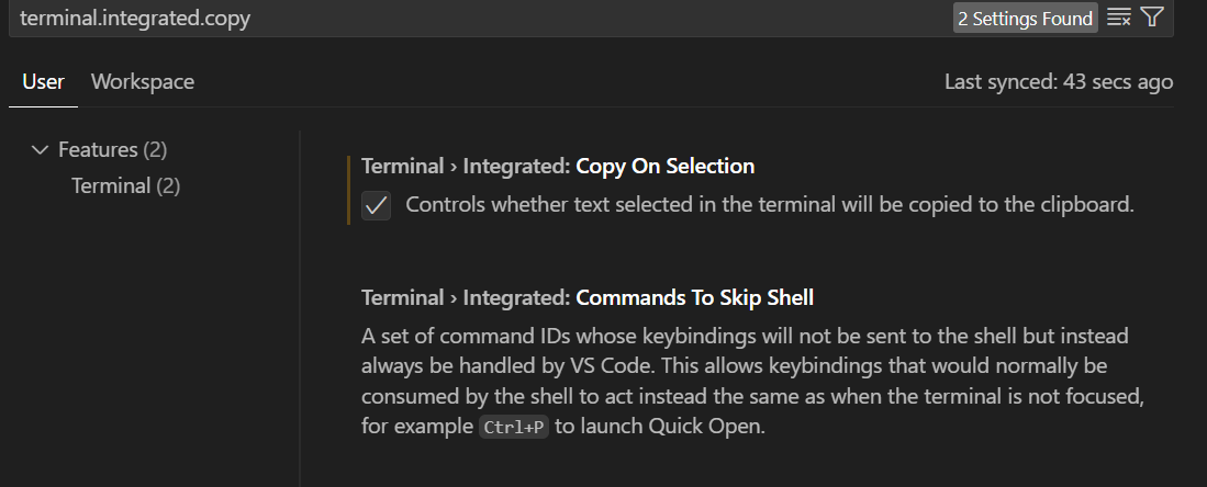 Search settings에서 "Terminal > Integrated: Copy On Selection"을 검색합니다.