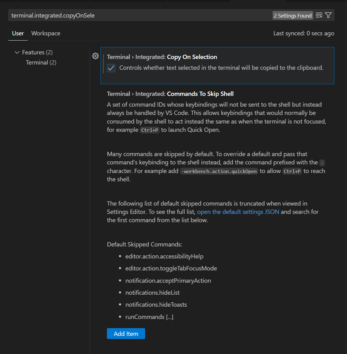 Search settings에서 "Terminal > Integrated: Copy On Selection"을 검색합니다.