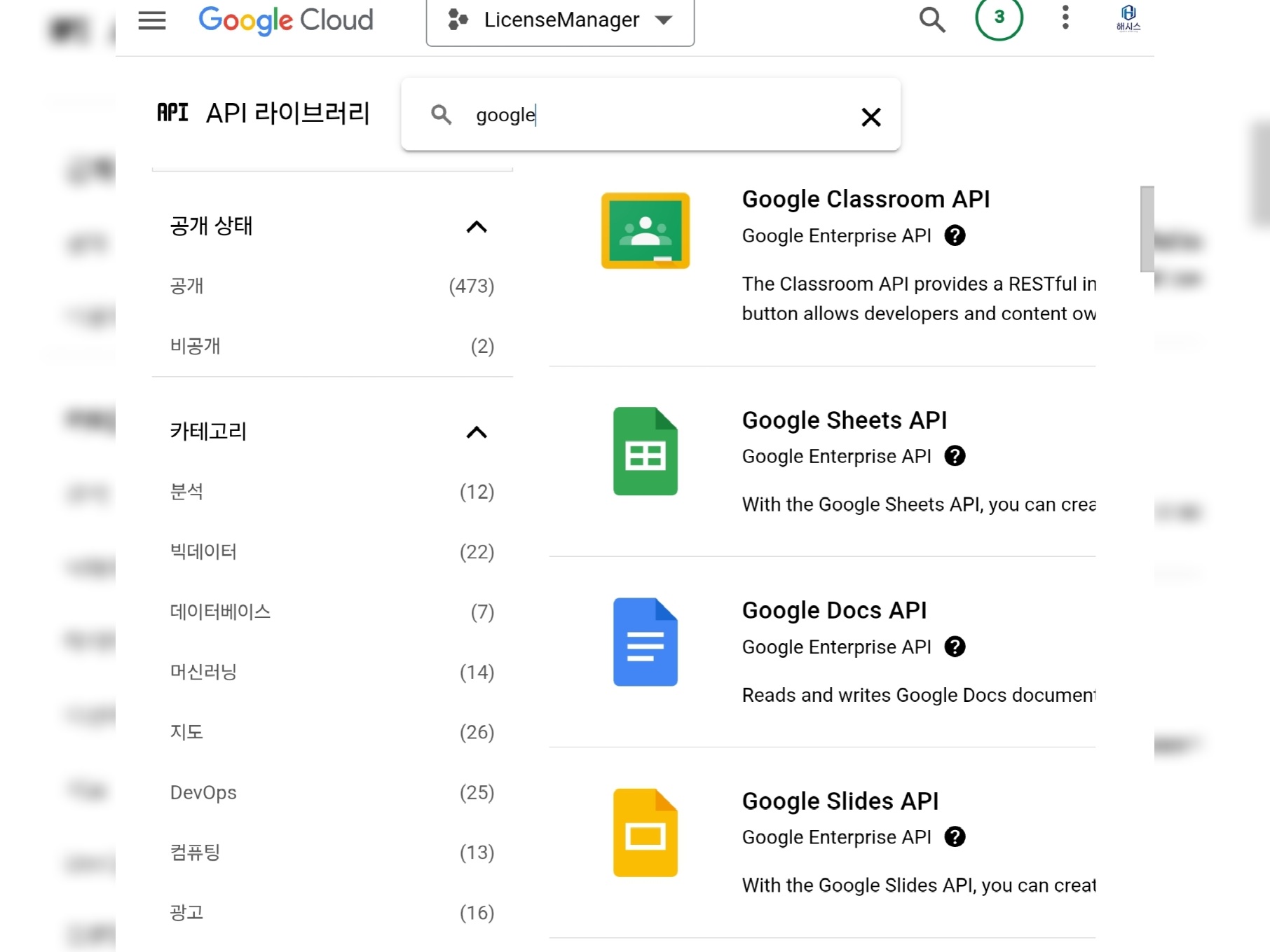 - 검색창에 "Google Sheets API" 입력
