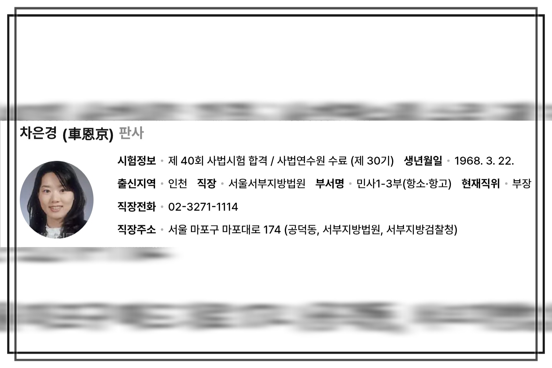 차은경 부장판사는 이화여자대학교 경제학과를 졸업하고 국책연구기관에서 연구원으로 근무한 경력을 가지고 있습니다. 이후 제40회 사법시험에 합격하여 사법연수원 30기를 수료했으며, 대형 로펌을 거쳐 판사로 임용되었습니다. 현재는 서울서부지방법원 민사1-3부에서 항소·항고 사건을 담당하는 부장판사로 재직 중입니다.